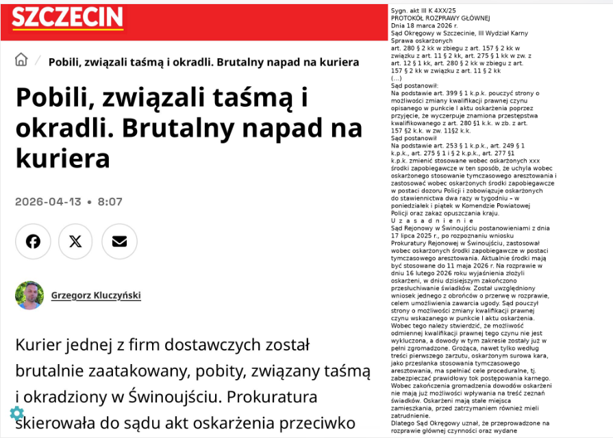 Sprawy karne, wymagają szybkiej reakcji, i profesjonalnej obrony. W jednej z prowadzonych przez nas spraw dotyczącej brutalnego napadu na kuriera Adwokat Krzysztof Tumielewicz wraz z mec. (...)