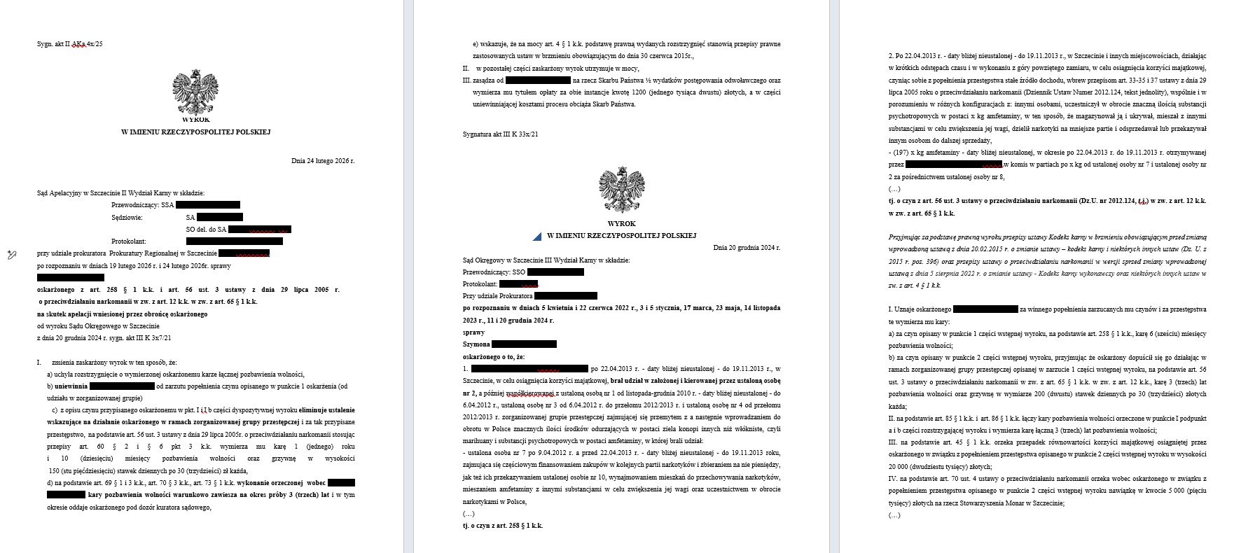 W apelacji podniesiono, że w sprawie istnieje całkowity brak dowodów na udział oskarżonego w zorganizowanej grupie przestępczej (art. 258 § 1 k.k.). Obrona wskazywała, że dla przypisania odpowiedzialności z art. 258 § 1 k.k. nie wystarcza sam obrót narkotykami czy kontakt w łańcuchu dostaw.